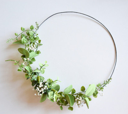 Pour cela je vais venir prendre mes feuilles type lierres et les grosses feuilles d'eucalyptus, et je vais venir les attacher avec du fils de fer sur un tiers de la couronne.